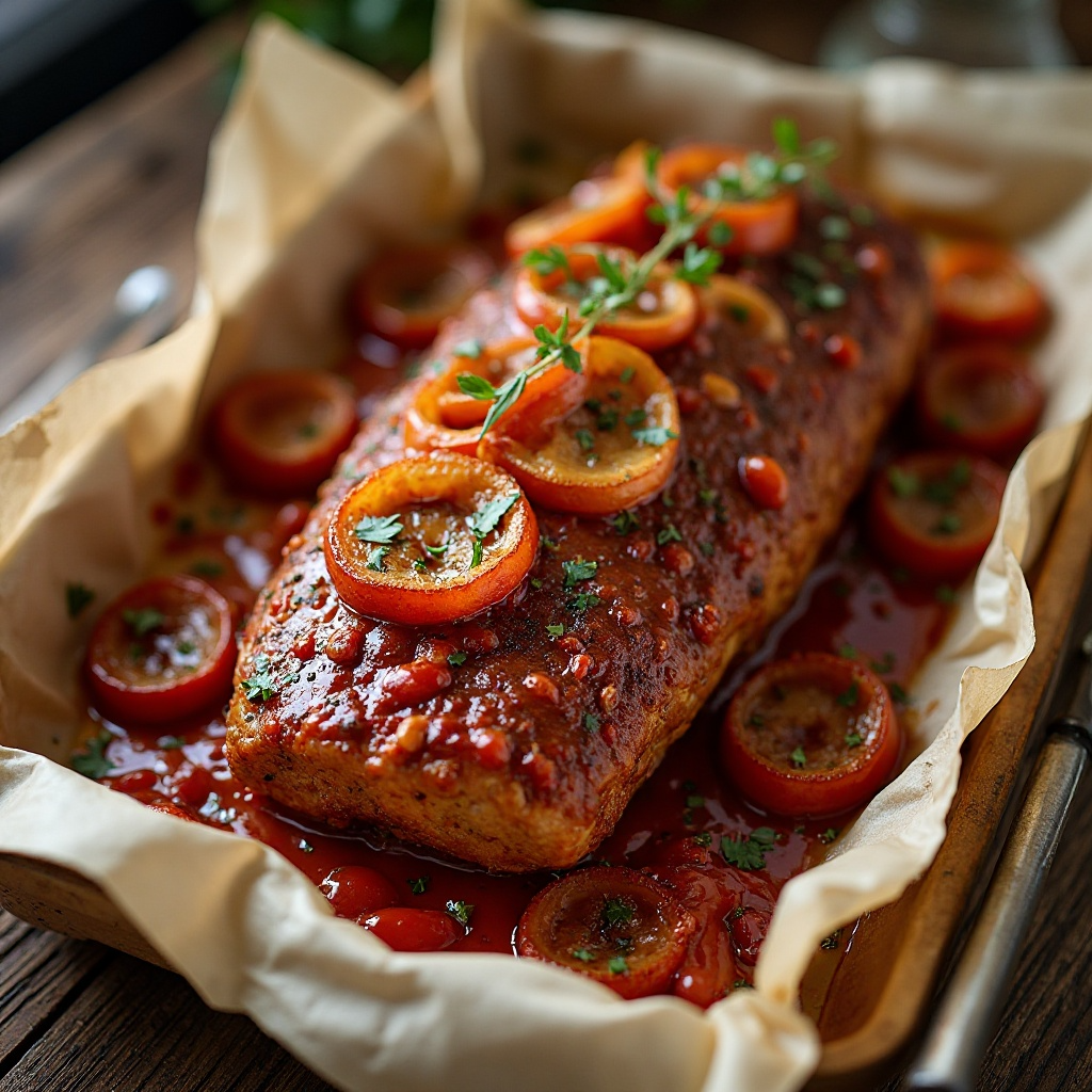 La carne de reno es conocida por ser una fuente magra de proteínas, rica en vitaminas B y minerales como hierro y zinc. Al cocinar la carne al horno con salsa de tomate y especias, se aprovecha la nutrición original del producto, mientras que las rodajas de cebolla añaden un toque crujiente y saludable, enriqueciendo la textura y el sabor.