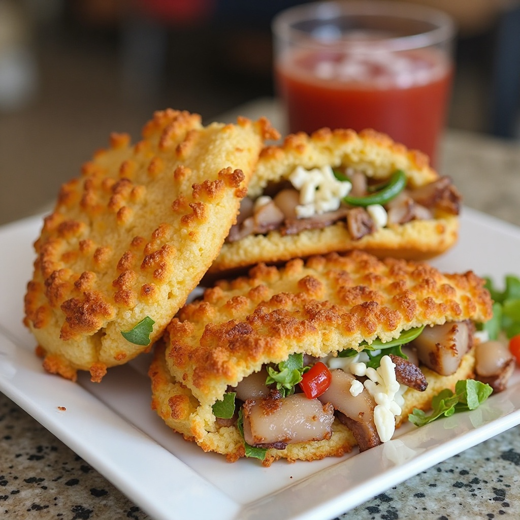 La arepa de chicharrón es una delicia crujiente y sabrosa, muy popular en la región oriental de Venezuela, especialmente en Barcelona, estado Anzoátegui. El chicharrón, que es la piel de cerdo frita hasta quedar crocante, se incorpora tanto en el relleno como en la masa de la arepa, lo que le da un sabor y textura únicos. Esta arepa es perfecta para quienes buscan una experiencia intensa de sabor, ideal para el desayuno o una cena llena de carácter.