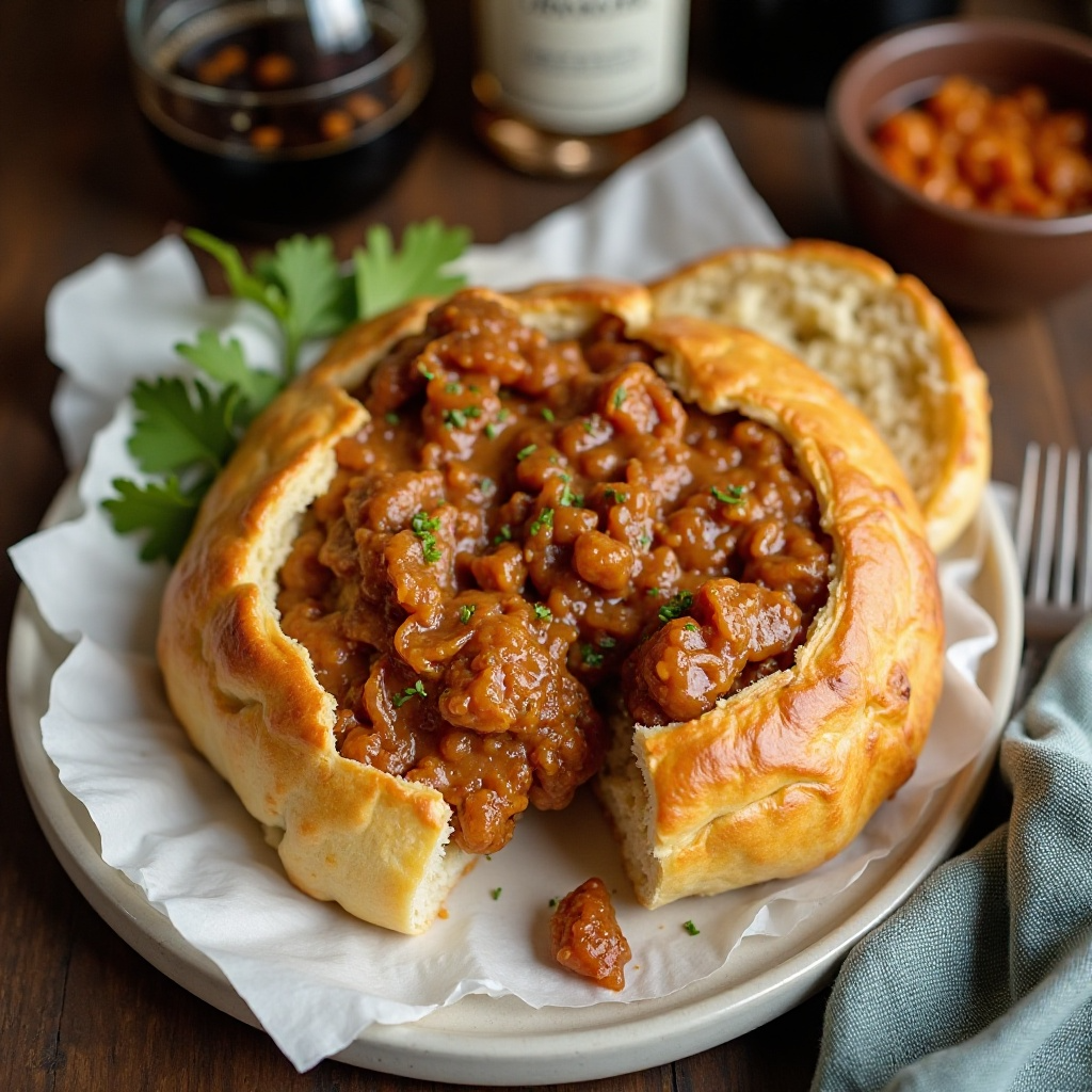 Sirve el bol de lêvedo caliente y acompáñalo con la salsa de salchicha y cebolla caramelizada. Este plato es una fusión deliciosa de tradiciones culinarias, perfecto para compartir en cualquier ocasión.