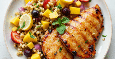 Receta de Trucha Arco Iris a la Parrilla con Ensalada de Quinoa y Frutas Tropicales