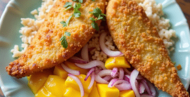 Receta de Pescado Frito con Salsa de Mango y Cebolla Roja