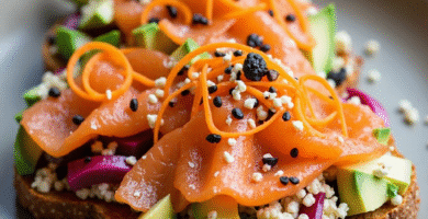 Receta de Smørrebrød de Salmón Noruego con Remolacha y Ensalada de Quinoa, típica de Hovedstaden, Dinamarca