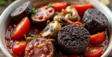 Receta de Black Pudding con Jamón Ibérico y Champiñones en Salsa de Tomates