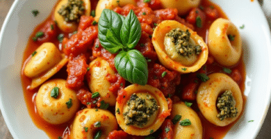 Receta de Tortellini al Pesto alla Genovese con Salsa de Tomate