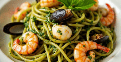 Receta de Spaghetti al Pesto con Mariscos de la Costa de Fiumicino
