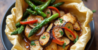 Receta Alpujarreña: Papillote de Pollo al Ajillo con Berenjenas y Espárragos