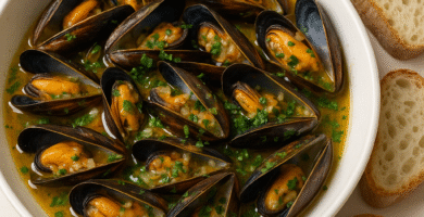 Receta de Mejillones al Albariño, especialidad de Fisterra, España