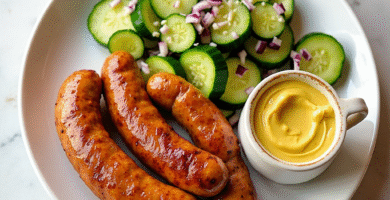 Receta de Salchichas de Solothurn con Salsas de Mostaza Suizas y Ensalada Fresca
