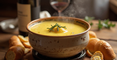 Receta de Fondue de queso con vino de Jura para la región de Jura, Suiza