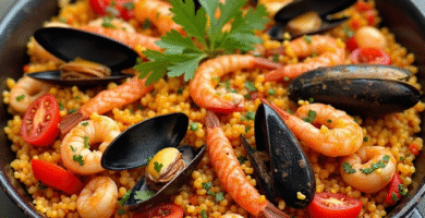 Receta de Paella de Mariscos con Sofrito de Tomate y Ají (Port-de-Sant-Miquel, Cataluña)