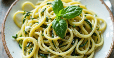 Receta de Pasta Fresca Ligera al Pesto alla Norma con Calabacín y Ricotta Salata