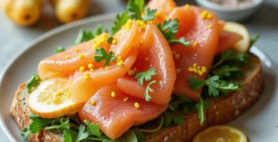 Receta de Smørrebrød de Salmón con Ensalada de Frutas de Copenhague
