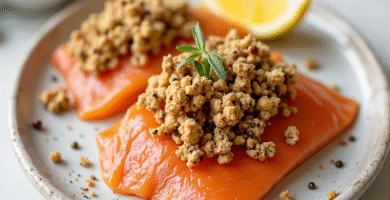 Receta de Pastilla de Salmon ahumado con Crumble de Avellanas para un Snack Finlandés