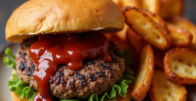 Receta de Bison Burger con Salsa BBQ y Patatas Bravas