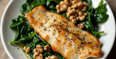Receta de Barramundi al Vapor con Guarnición de Espinacas y Nueces para Wadeye, Australia
