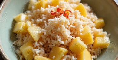 Receta de Arroz pegajoso con Frutas Tropicales de Battambang, Camboya