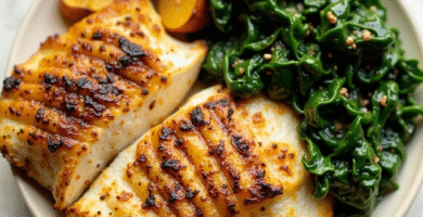 Receta de Pescado a la Parrilla con Chips de Plátano y Espinacas (Makwana)