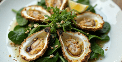 Receta de Ostras Frescas de la Bahía de Chesapeake con Ensalada de Limón y Espinacas