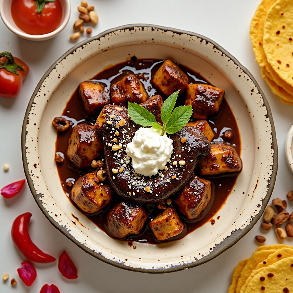 - Sirve el mole con tortillas calientes, crema fresca y queso panela rallado. Decora con el chile poblano y sirve inmediatamente.