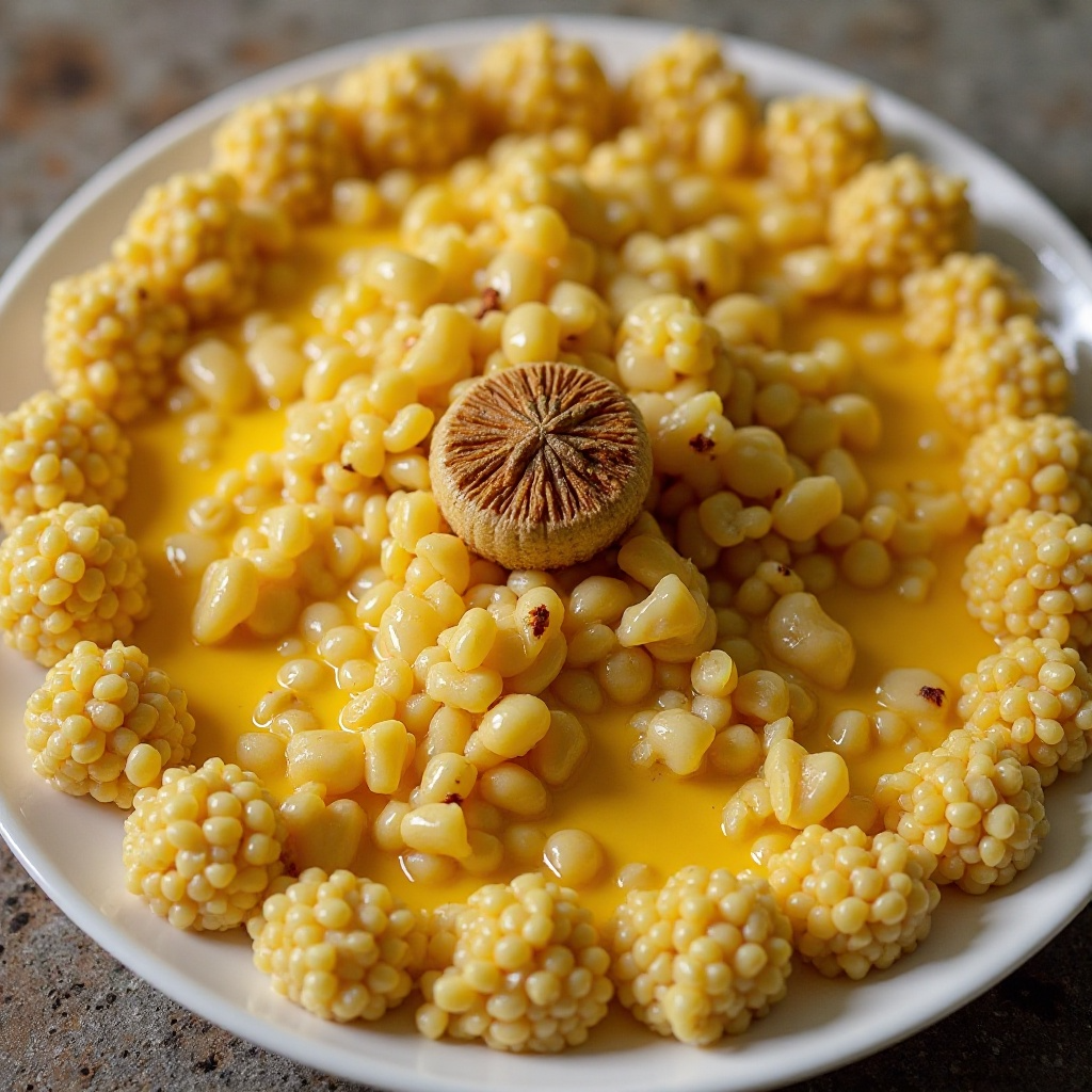 El Akple es un pilar en la dieta togolesa, especialmente en las regiones costeras donde se cultivan granos como el maíz. La inclusión de una mignardise de caramelo de coco transforma esta receta en una experiencia culinaria única que celebra la rica diversidad gastronómica del país. Este plato refleja cómo los ingredientes locales son adaptados y disfrutados de maneras innovadoras, fusionando tradiciones ancestrales con influencias contemporáneas.