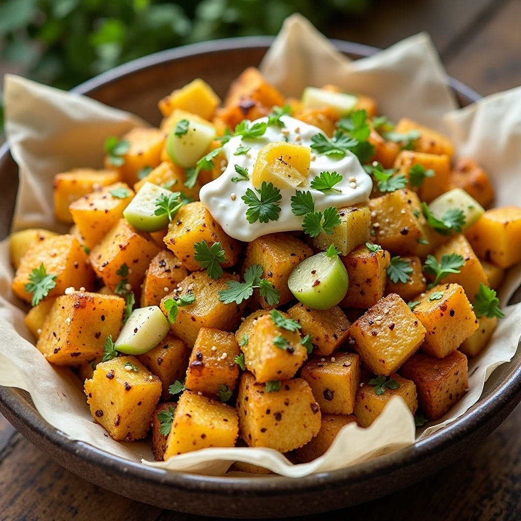 El Aloo Chaat es una deliciosa versión de chaat popular en Nueva Delhi, que combina papas fritas crocantes con una variedad de ingredientes frescos y especias. Es un plato vibrante y lleno de sabor perfecto para disfrutar en cualquier momento del día.