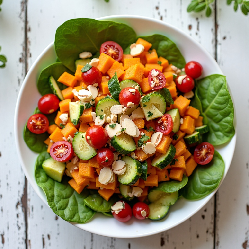 - En un bol grande, mezcla las amigdalota, la zanahoria rallada, el pimiento rojo, el tomate cherry, el pepino y las espinacas.