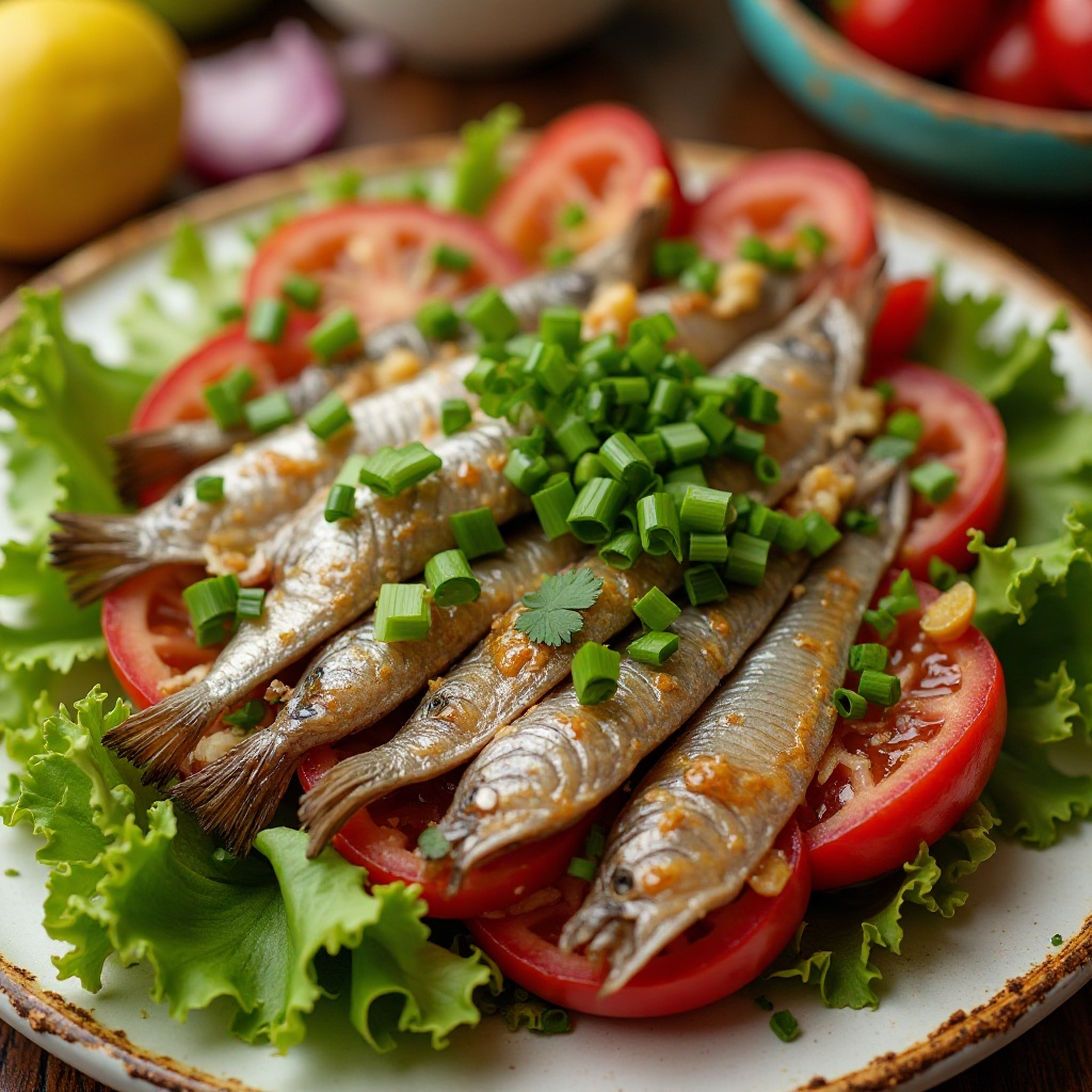 5. Sirve las anchoas sobre una cama de ensalada de lechuga o tomate. Agrega cebollín fresco y, si lo deseas, cebolla picada para un toque extra de sabor.