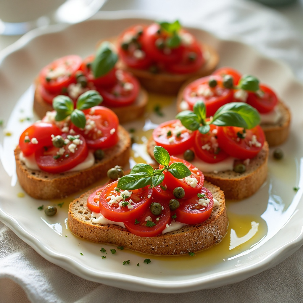 5. Sirve las bruschettas frías, adornadas con hojas frescas de rúcula o albahaca si lo deseas.