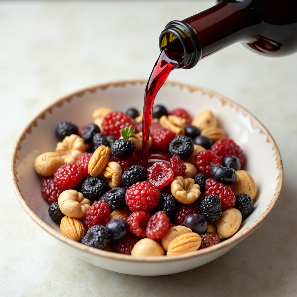 - En un tazón grande, mezcla todas las frutas secas (uvas pasas, pasas rojas, arándanos secos y frambuesas secas) junto con las almendras tostadas y las nueces picadas.
