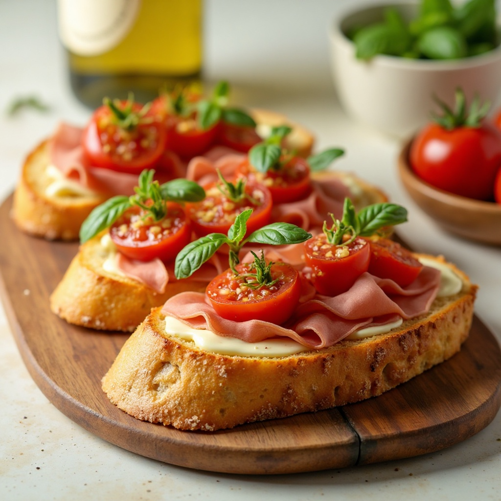 Bruschetta es un aperitivo italiano clásico que se sirve en muchas regiones del país. En Asolo, Italia, popularmente conocido por su producción de prosecco, una versión refinada de este aperitivo incorpora el vino prosecco para añadir un toque único de frescura y sabor. Este plato es perfecto para disfrutar en pequeñas cantidades durante reuniones o como parte de una cata de vinos.