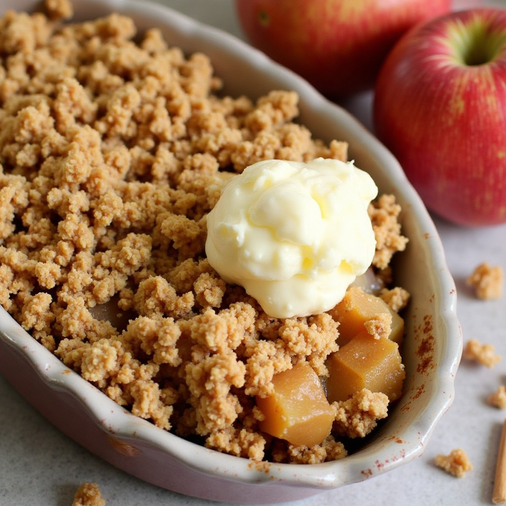 - Esparcir el crumble sobre las manzanas, asegurándote de cubrir toda la superficie de manera uniforme. Hornear durante 30-35 minutos o hasta que el crumble esté dorado y crujiente.