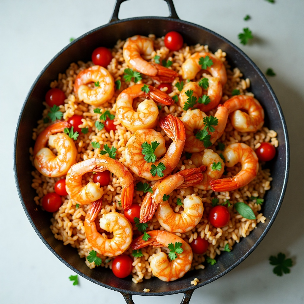7. Una vez el arroz esté listo, espolvorea las gambas por encima y mezcla suavemente para integrar los sabores. Agrega sal y pimienta al gusto.
