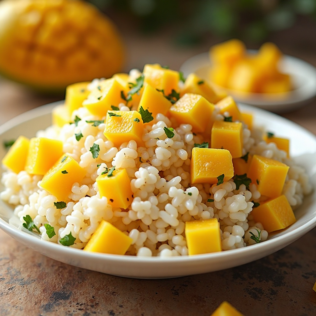 5. Agrega los cubos de mango y chochoyote al arroz, asegurándote de que todos los ingredientes se mezclen bien.