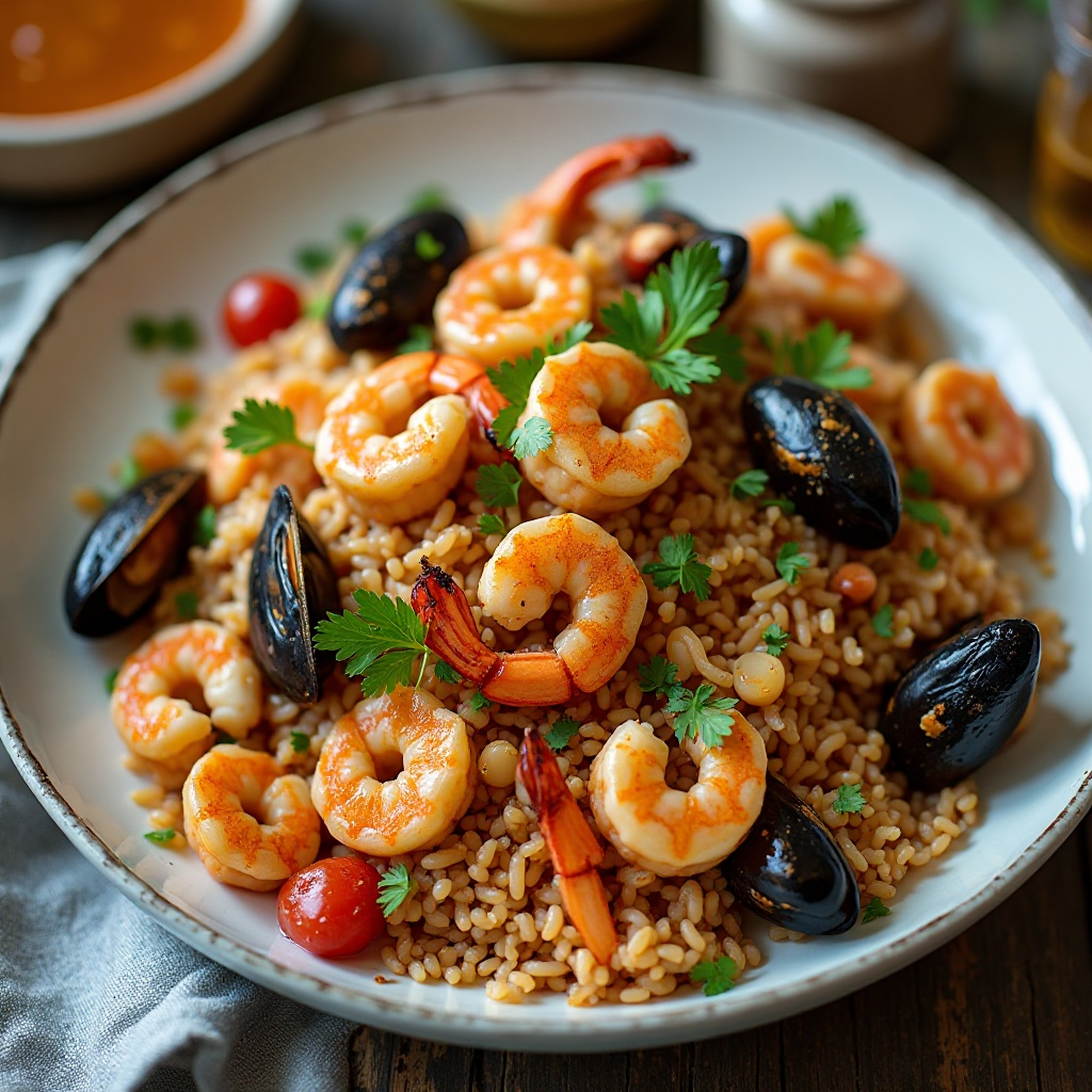 Este arroz con mariscos es una fusión gastronómica que toma elementos del Golfo de México y los aplica en Al-Khor, Catar. La receta utiliza mariscos típicos de la región como camarones, mejillones, y calamares, combinados con un arroz aromático y especiado que recuerda a las costas mexicanas.