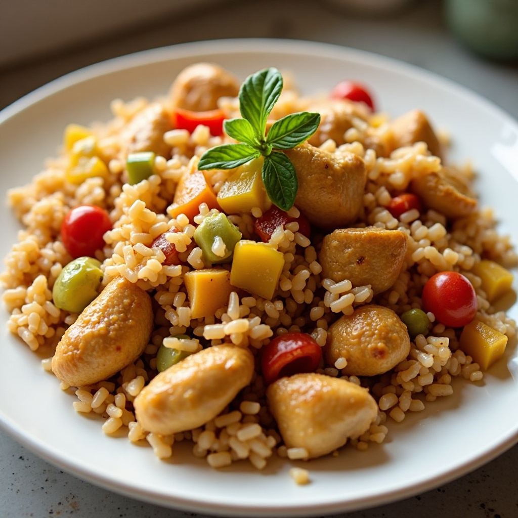 Este plato es una fuente saludable de proteínas y fibra gracias al arroz y el pollo. Los vegetales frescos aportan vitaminas y minerales esenciales. Para una versión más ligera, puedes optar por un caldo de verduras en lugar de uno de pollo.
