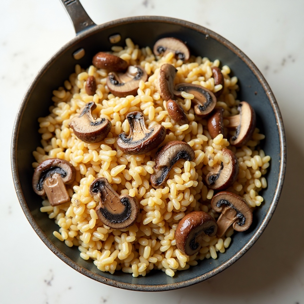 6. Cubre la sartén y cocina a fuego medio durante unos 15-20 minutos, o hasta que el arroz esté cocido y los champiñones estén tiernos.