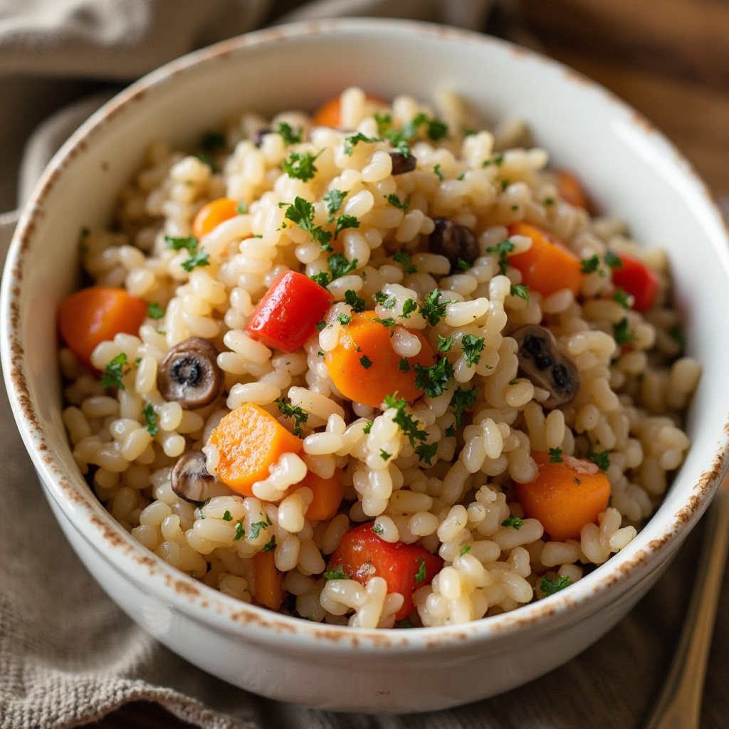 El arroz salvaje es una excelente fuente de fibra y antioxidantes, lo que lo hace saludable para el corazón y beneficioso para el sistema digestivo. La adición de vegetales como la cebolla, zanahorias y champiñones proporciona vitaminas y minerales esenciales. Asegúrate de controlar la cantidad de sal si tienes restricciones dietéticas.