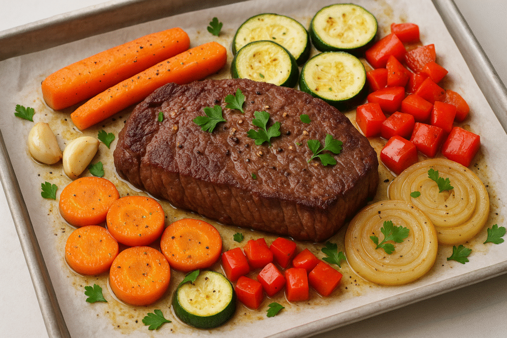 5. Hornea por aproximadamente 25-30 minutos, o hasta que la carne esté cocida al gusto y las verduras estén tiernas.