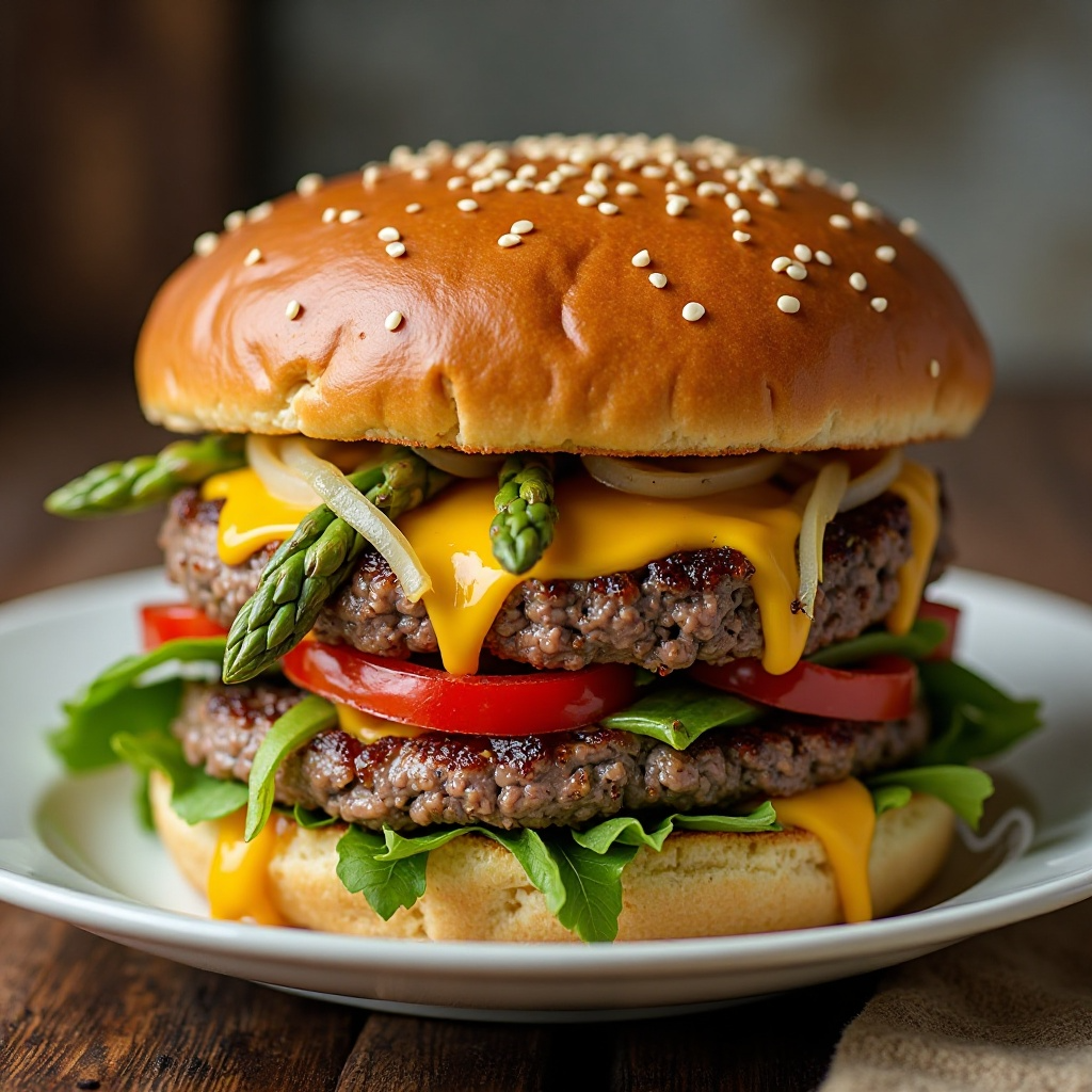 El Asparagus es rico en vitaminas y minerales esenciales, como la vitamina K, que contribuye a la salud ósea. La hamburguesa de carne, aunque contiene grasas saturadas, puede ser equilibrada con el uso moderado de aceite y selección de cortes magros. Las verduras en la mezcla y la opción de queso cheddar en rodajas permiten un balance nutricional adecuado.