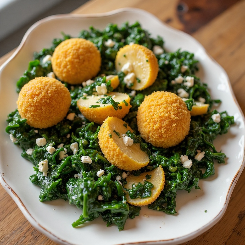 - Sirve las bolitas de Attiéké calientes y acompáñalas con la mezcla de espinacas y queso de cabra para disfrutar de un equilibrio entre el tradicional sabor de Attiéké y los sabores frescos y tiernos de las espinacas y el queso.