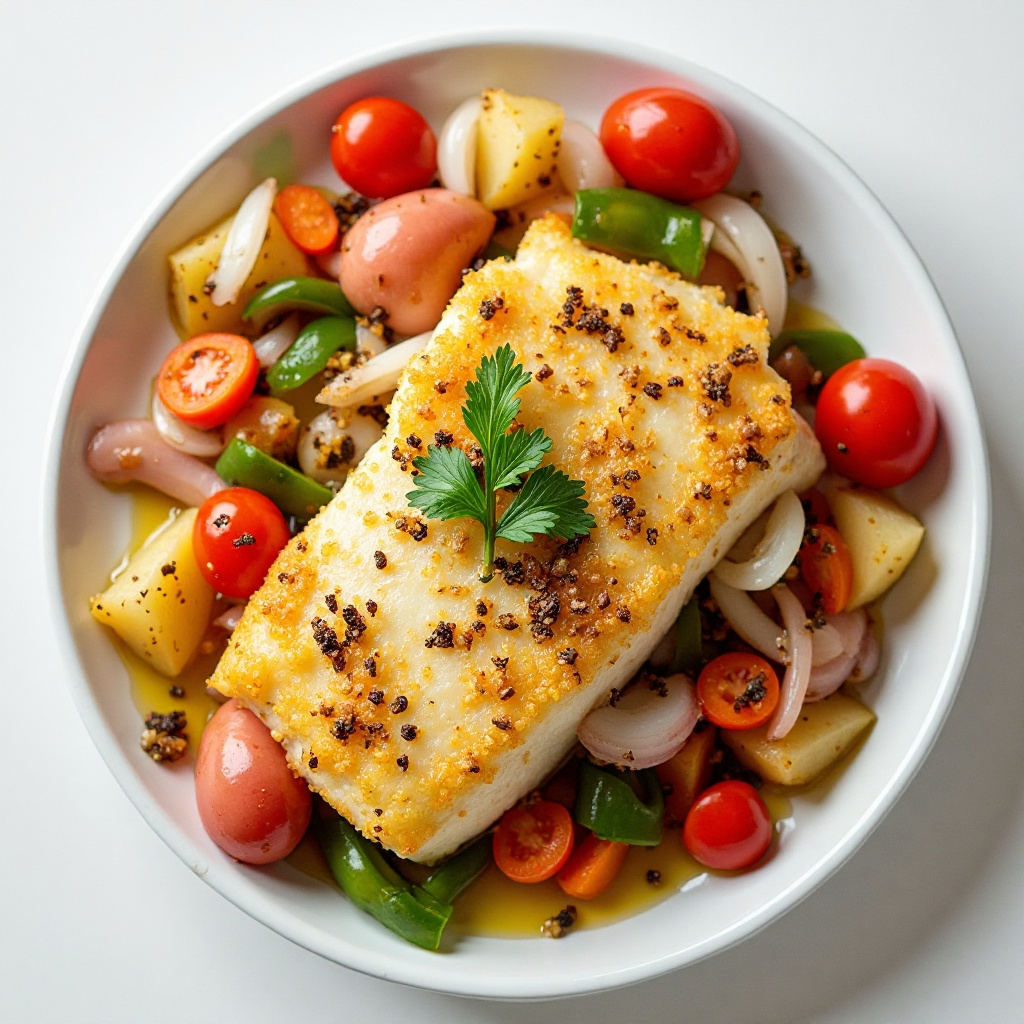7. Una vez listo, retira el bacalao del horno y sirve caliente, adornado con las verduras y un toque de perejil fresco.