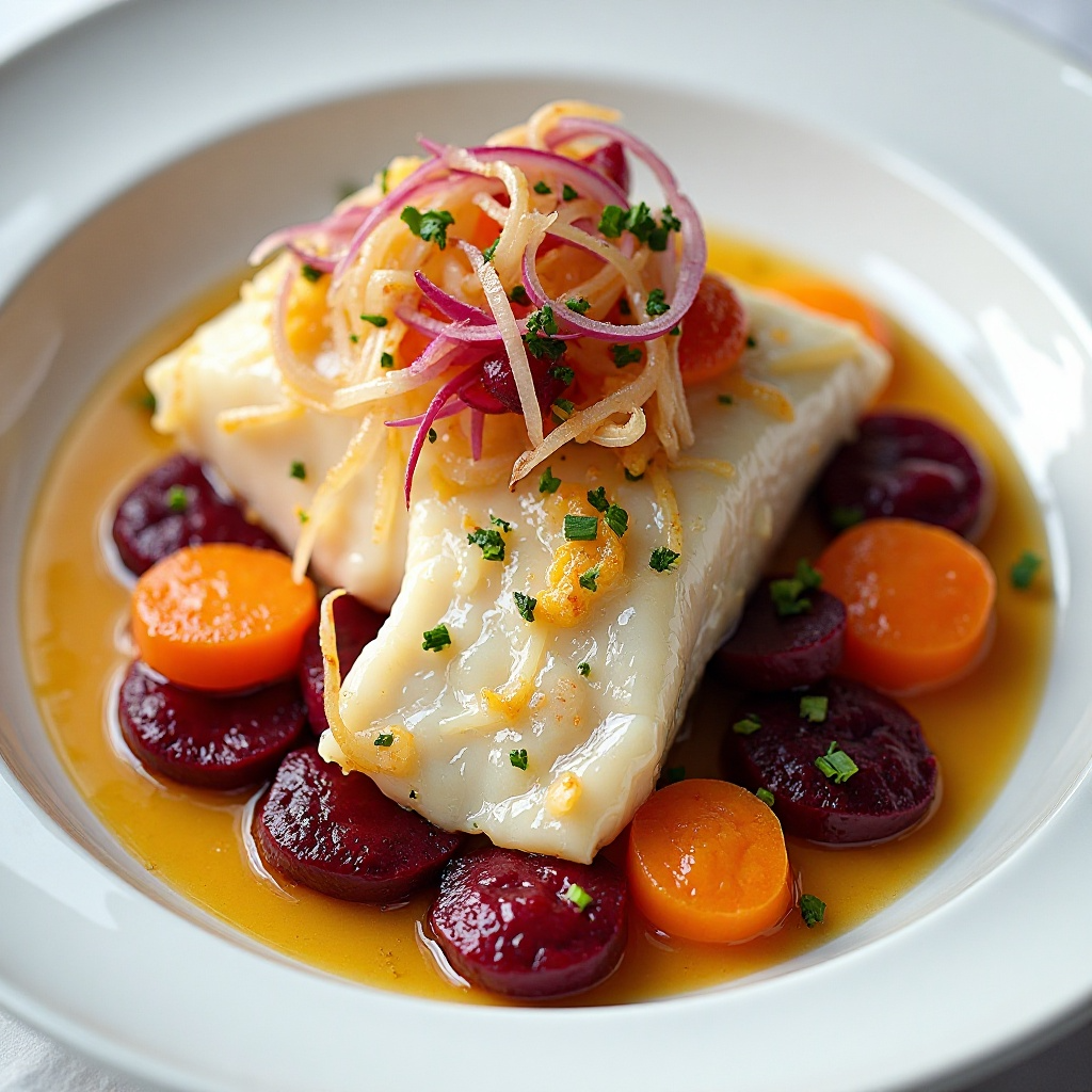 El bacalao es un ingrediente central en la cocina noruega, especialmente en Hordaland, donde se pesca y se prepara con recetas tradicionales que resaltan su sabor único. Esta receta presenta bacalao fresco marinado con remolacha y zanahorias, ingredientes abundantes en la región, ofreciendo un plato equilibrado de sabores y texturas.