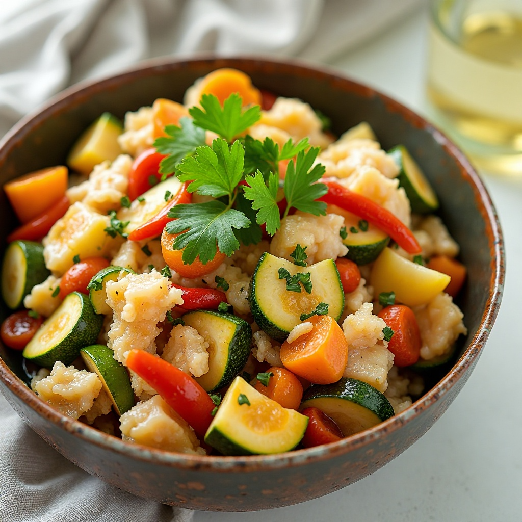 - Agrega el bacalhau desmenuzado, mezcla bien para que los ingredientes se mezclen y suavicen al contactar con la cebolla y los vegetales. Luego, agrega el calabacín y cocina por unos 5 minutos más.
