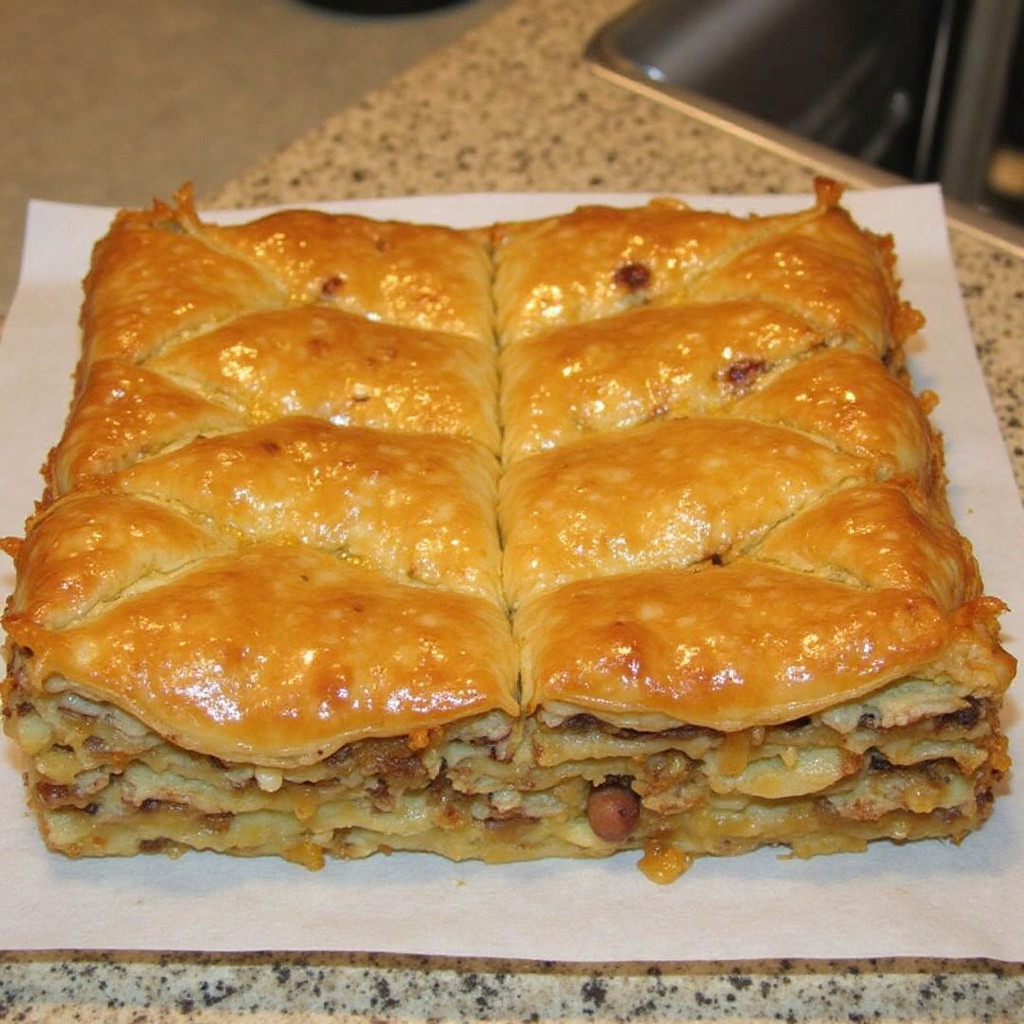 - Cubrir con otra capa de filo y repetir el proceso, alternando capas de filo y mezcla de nueces, hasta que se hayan utilizado todas las hojas de filo y la mezcla de nueces esté completamente cubierta.