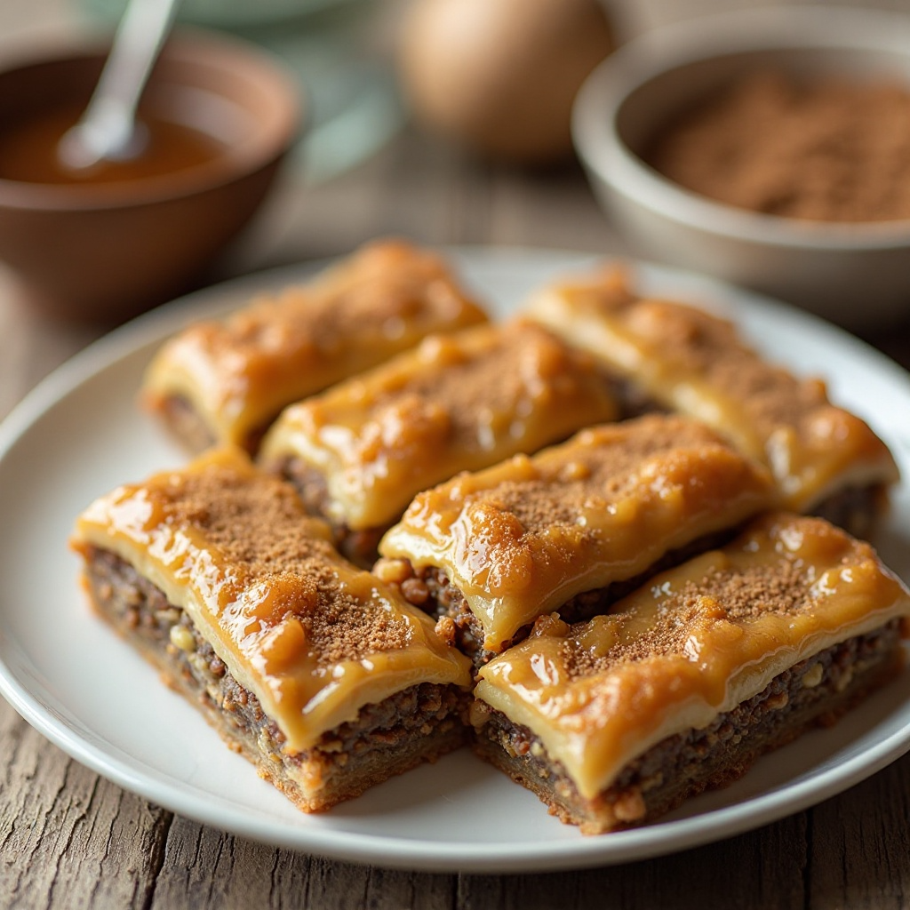 - Una vez horneado, deja que el baklava repose un momento antes de desmoldarlo en una bandeja para servir. Vierte la miel caliente sobre él, permitiendo que se filtre por las capas y adorne con cintas decorativas si lo deseas.