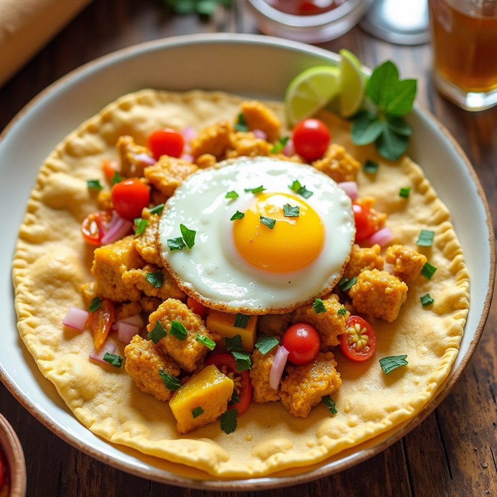 - Para servir: Coloca la salsa de pollo al curry sobre una baleada. Añade huevo frito por separado y córtalo en rodajas. Sirve con cebolla morada y un chorrito de jugo de lima para realzar el sabor.