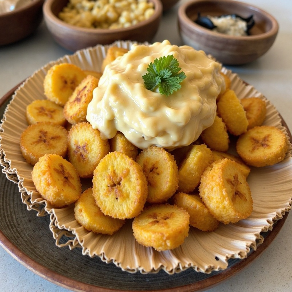 Bubanza es una región de Burundi conocida por su rica cultura y tradición culinaria. La comida aquí a menudo refleja la abundancia de los productos agrícolas locales, como los plátanos, que son un ingrediente clave en muchas recetas. Este plato, Bananes Frites con Sauce de Plátano, es un clásico que combina el crujiente de las patatas fritas con el dulzor y textura suave del plátano frito, todo cubierto con una salsa cremosa de plátano.