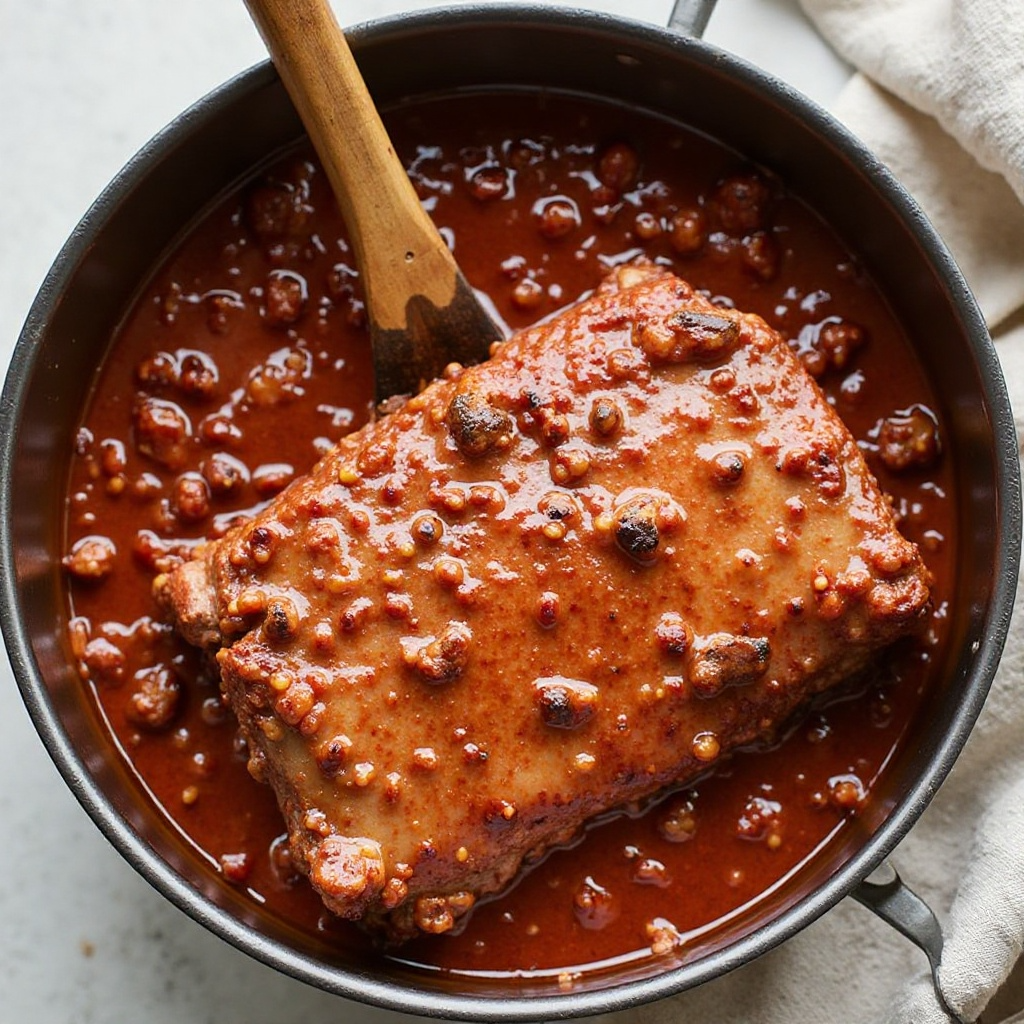 7. Vuelve a colocar la carne de cerdo en el fondo del sartén, sumergiéndola por completo en la salsa. Asegura que esté cubierta para retener todos los sabores durante la cocción.