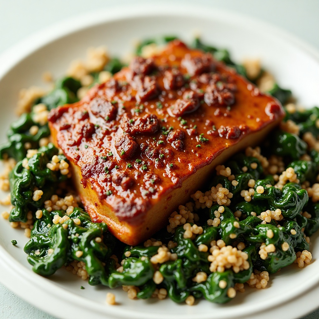 6. Sirve este plato como entrada o almuerzo, disfrutando de la combinación de sabores ahumados de la barbacoa con las texturas saludables de las espinacas y el quinoa.