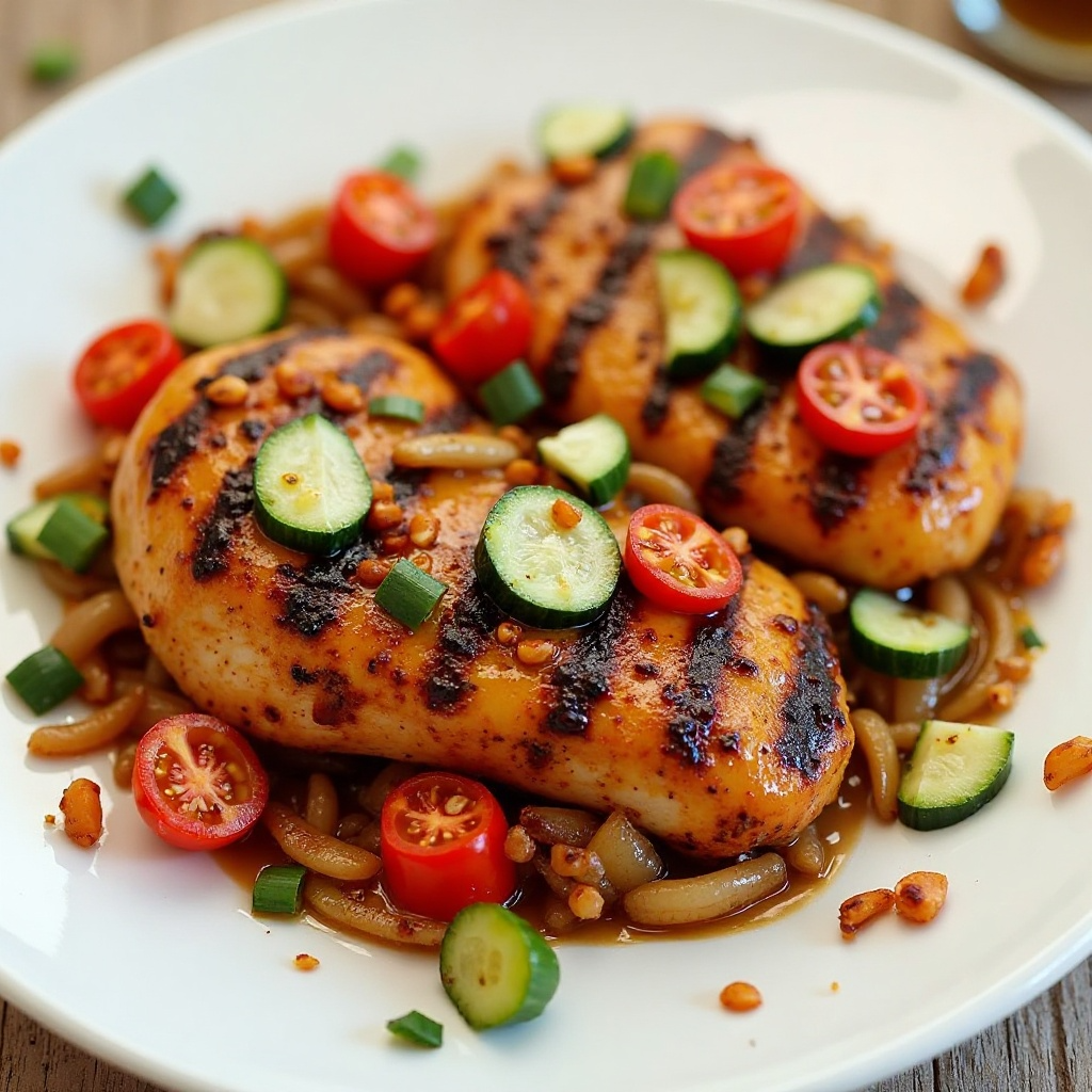 6. Una vez cocidas las pechugas, retíralas de la parrilla y déjalas reposar por unos minutos. Luego, sirve sobre una cama de cebolla caramelizada. Decoración final con tomates cherry, pepino inglés y un chorrito de salsa de barbacoa adicional.
